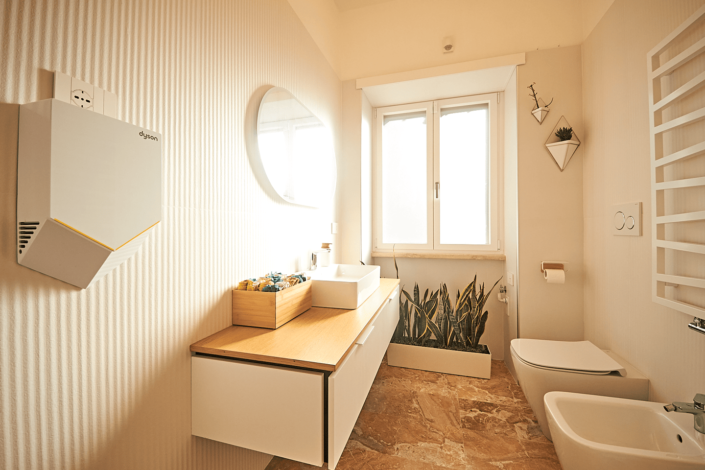Un bagno principale, con antibagno e bagno dotato di tutti i sanitari. Ciascuno dei due lavandini è attrezzato con rubinetto automatico a sensore di prossimità, ed asciugamani elettrico da 12", con filtro HEPA, di ultima generazione.