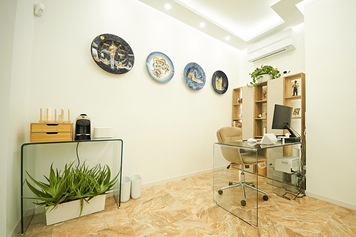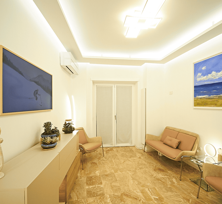 La marina abruzzese realizzata dal Pittore e Avvocato Stefano Notarmuzi crea un'atmosfera evocativa e rilassante per il paziente in sala d'attesa mentre un sistema audio con filodiffusione, una TV "The Frame", un Terrarium, e vasi con piante grasse completano l'arredamento di questo spazio.