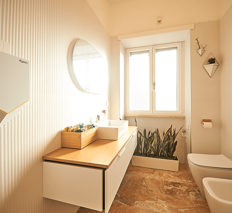 Un bagno di servizio, dedicato al personale, con sistema aspirante e filtrante a carboni attivi di livello industriale.